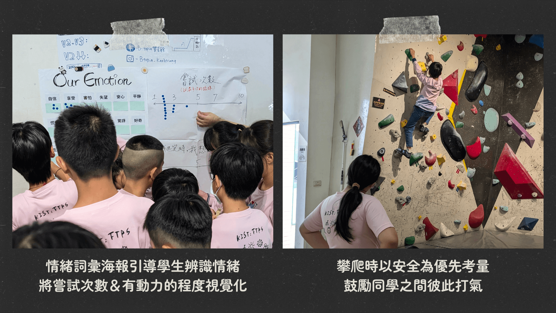 於是,我設計以室內抱石為體驗,希望藉由必須面對墜落與不斷重新嘗試的過程,引導學生覺察自己面對挫折的反應,並練習在課業學習以外的場景運用成長型的語言鼓勵自己與同學。