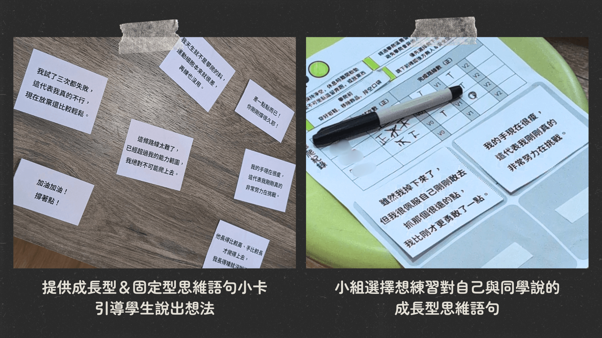 我將字卡散開,請學生挑選和自己的想法最接近的話語。當時,雖然多數學生選擇的是偏向成長型思維的語句,但有一位男同學舉起了這張卡片:「我天生就不是攀爬的料,運動細胞本來就很差,再練也沒用。」