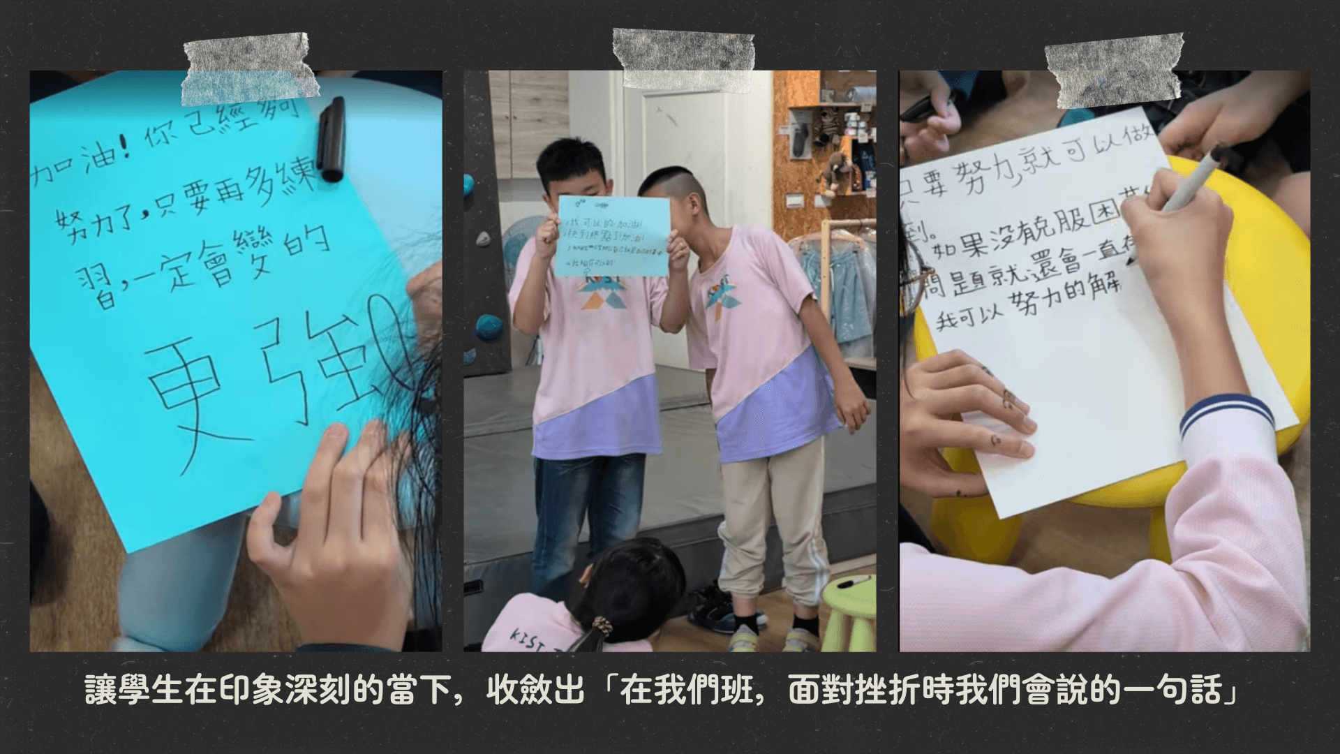 孩子們在三個回合的攀爬過程中,不斷展露笑容與持續上牆嘗試,也有不少同學會鼓勵彼此。而這段同時練習攀爬和說出成長型話語的過程,收尾在請各組寫下 「在我們班,面對挫折時我們會說的一句話」,目的正是要讓學生在印象深刻的當下,將這次的經驗變成帶得走的學習,在未來延續。看著他們寫下並對全班分享這些話,很有力量——