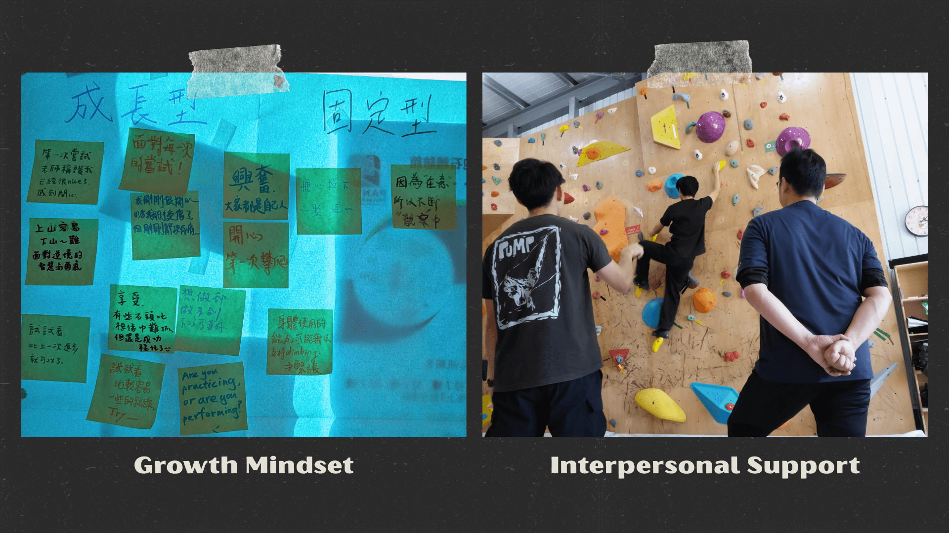為了幫助大家練習實踐成長型思維,我們練習使用「正向自我對話」來調節壓力。邀請每位老師想一句能鼓勵自己的話,例如:「試試看,比上一次進步就可以了!」或是問自己:「Are you practicing or performing?」轉變心態,就能化解面對岩牆的遲疑。